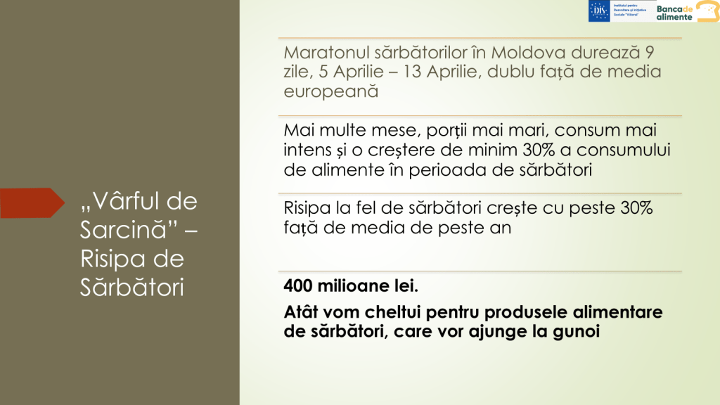 Situația se agravează în perioada sărbătorilor susține Veaceslav Ioniță, când consumul alimentar crește cu peste 30%, iar risipa depășește acest nivel. Pentru masa de sărbătoare, moldovenii cheltuie în medie 7700 lei, echivalentul a până la 60% din venitul lunar, determinând adesea gătirea unor cantități cu 150% mai mari decât necesarul. Se estimează că cel puțin 400 de milioane de lei cheltuiți pentru produsele de sărbători ajung anual la gunoi. Dacă în 2025, risipa și pierderile de produse alimentare au fost estimate la 8,9 miliarde de lei, pentru 2026 acestea ar putea ajunge la 9,6 miliarde de lei, dintr-un total de 21,3 miliarde de lei generate de acest fenomen.