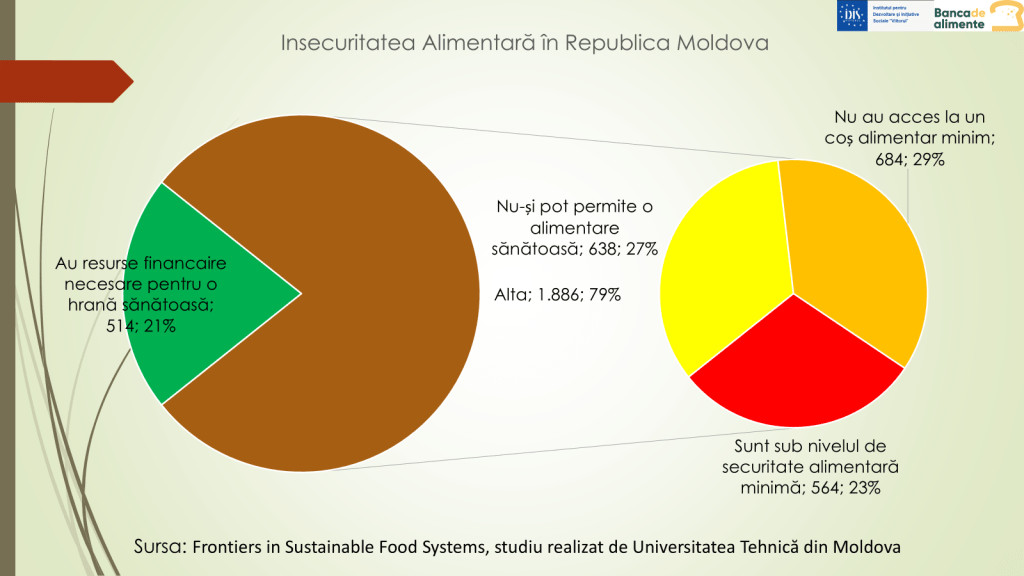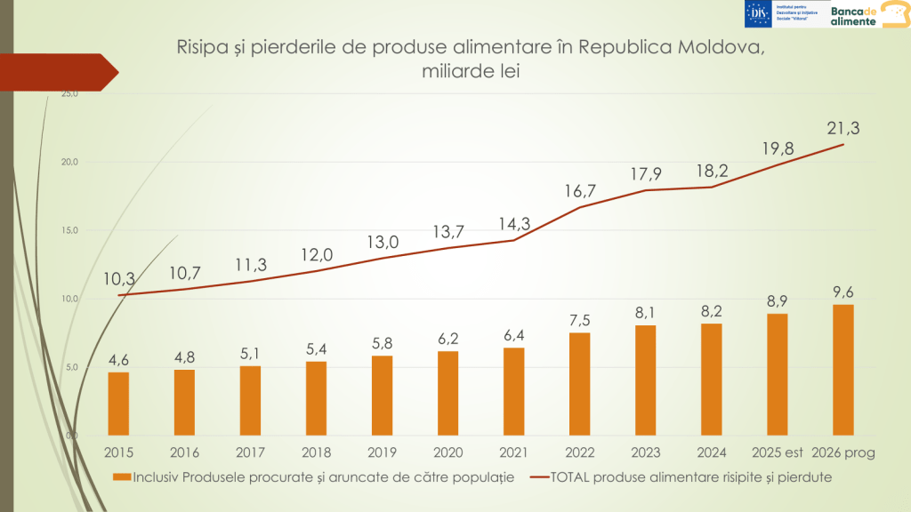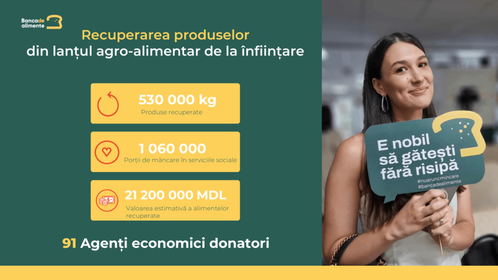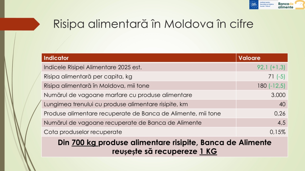 Deși Republica Moldova rămâne una dintre cele mai sărace țări din Europa, nivelul risipei alimentare este extrem de ridicat, afectând atât economia gospodăriilor, cât și bunăstarea socială. În Republica Moldova sunt aruncate zilnic aproape 1,1 milioane de porții de mâncare, volum care crește până la 1,5 milioane de porții pe zi în perioada sărbătorilor, în timp ce jumătate din populația țării nu își permite un coș alimentar minim, iar aproximativ 80% dintre cetățeni nu își permit o alimentație sănătoasă.