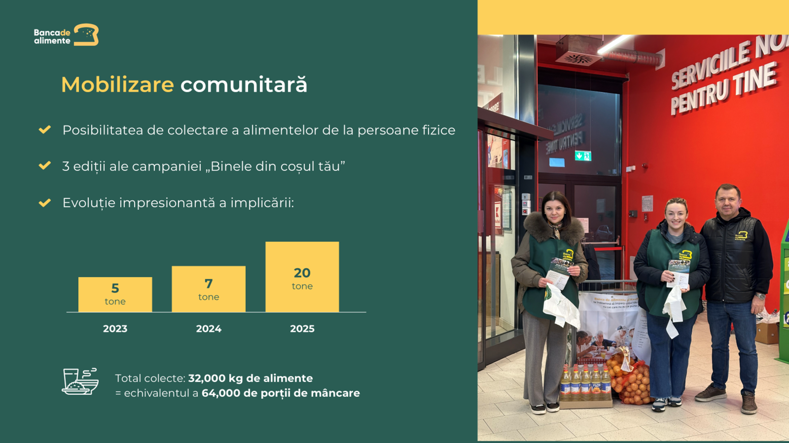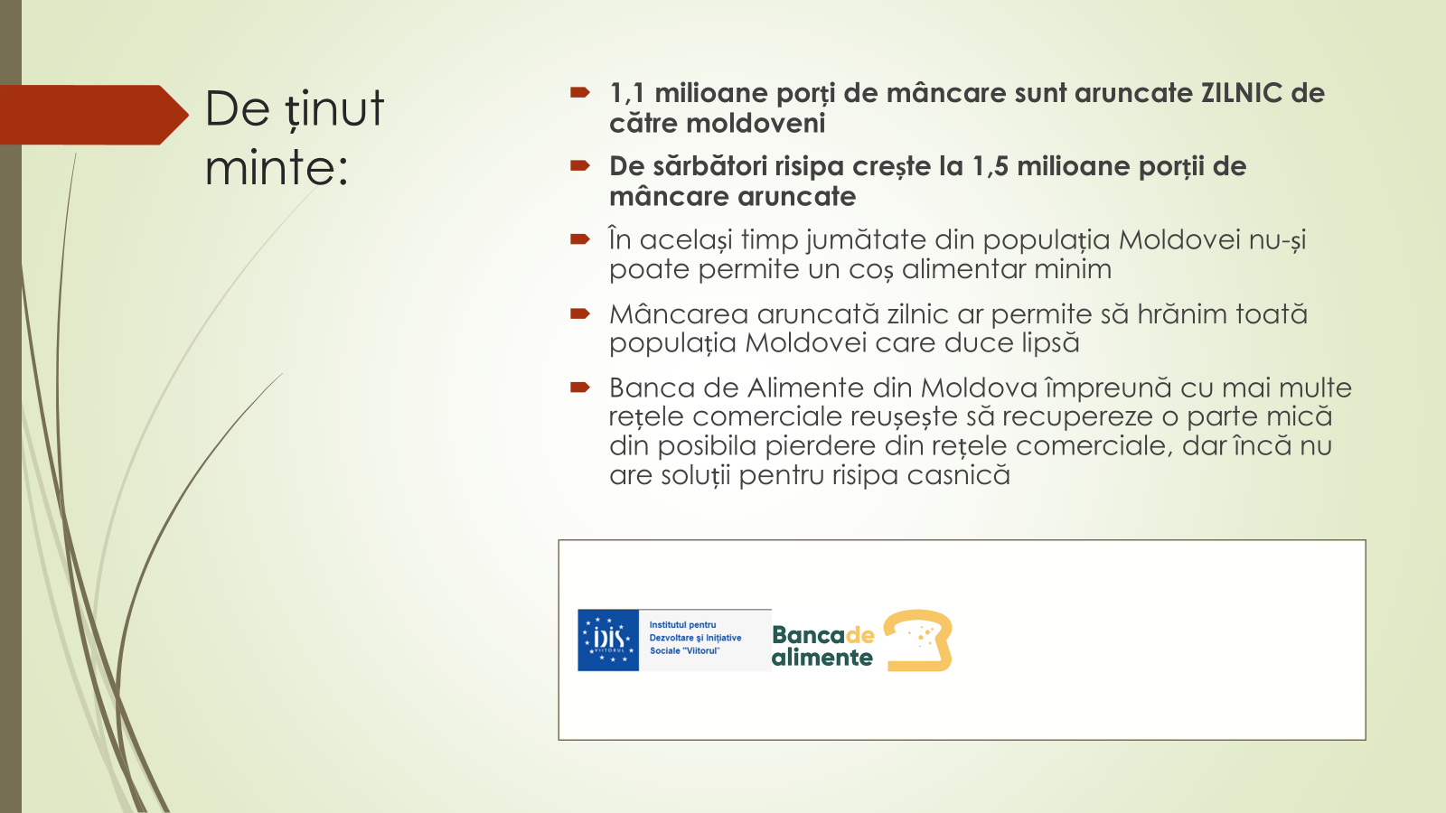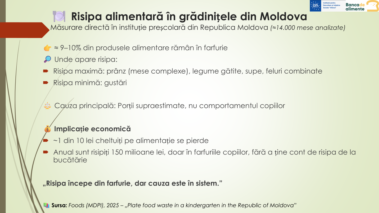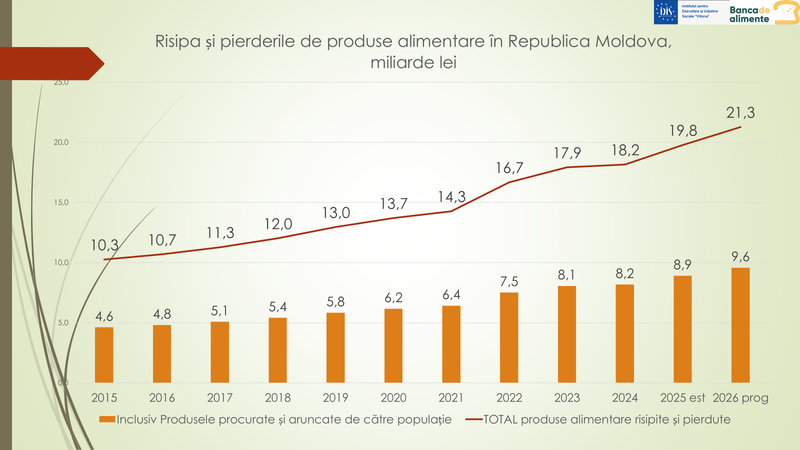 Deși Republica Moldova rămâne una dintre cele mai sărace țări din Europa, nivelul risipei alimentare este extrem de ridicat, afectând atât economia gospodăriilor, cât și bunăstarea socială. În Republica Moldova sunt aruncate zilnic aproape 1,1 milioane de porții de mâncare, volum care crește până la 1,5 milioane de porții pe zi în perioada sărbătorilor, în timp ce jumătate din populația țării nu își permite un coș alimentar minim, iar aproximativ 80% dintre cetățeni nu își permit o alimentație sănătoasă.