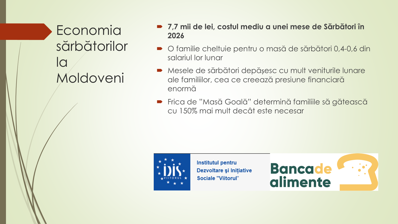 Situația se agravează în perioada sărbătorilor susține Veaceslav Ioniță, când consumul alimentar crește cu peste 30%, iar risipa depășește acest nivel. Pentru masa de sărbătoare, moldovenii cheltuie în medie 7700 lei, echivalentul a până la 60% din venitul lunar, determinând adesea gătirea unor cantități cu 150% mai mari decât necesarul. Se estimează că cel puțin 400 de milioane de lei cheltuiți pentru produsele de sărbători ajung anual la gunoi. Dacă în 2025, risipa și pierderile de produse alimentare au fost estimate la 8,9 miliarde de lei, pentru 2026 acestea ar putea ajunge la 9,6 miliarde de lei, dintr-un total de 21,3 miliarde de lei generate de acest fenomen.