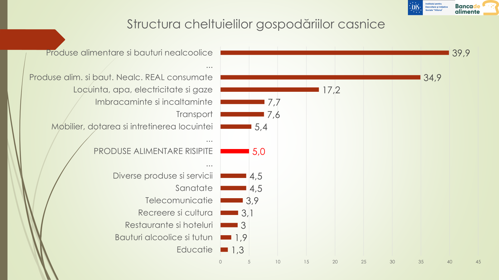 Datele analizate de către economist arată că 56% din risipa alimentară provine din gospodăriile casnice, urmate de industria alimentară cu 16%, comerțul cu amănuntul – 10%, restaurantele – 9,5%, iar producția primară – 8%. În același timp, moldovenii alocă aproximativ 40% din veniturile lor pentru produse alimentare, dintre care 5% ajung să fie irosite, generând pierderi financiare mai mari decât cheltuielile pentru sănătate, educație sau recreere.