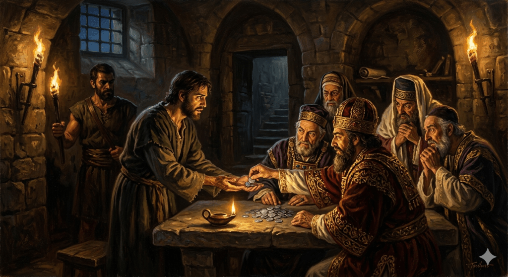 Dincolo de aspectul spiritual, această negociere are o încărcătură simbolică și economică brutală. Preoții i-au oferit lui Iuda 30 de arginți. Această sumă nu a fost aleasă la întâmplare; era prețul fixat de Legea lui Moise drept compensație pentru un rob omorât din imprudență. Mesajul lor era unul subtil și disprețuitor: „Iată ce valoare are Isus în ochii noștri – valoarea unui sclav.”
